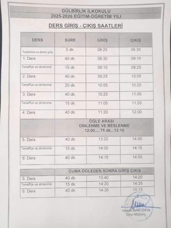 2025-2026 EĞİTİM ÖĞRETİM YILI DERS GİRİŞ VE ÇIKIŞ SAATLERİ