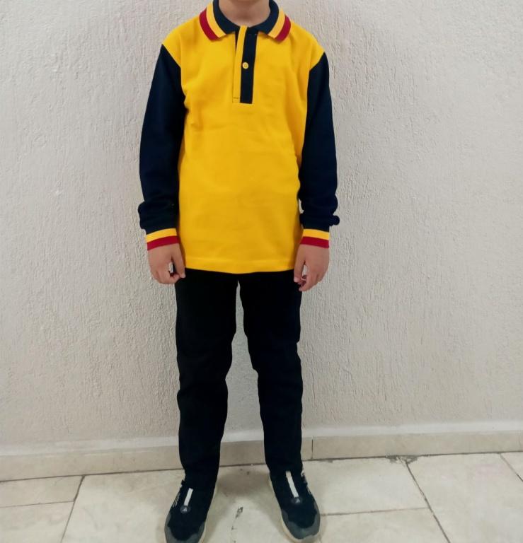 Kolları Koyu lacivert kol bantları yaka ile aynı (Kol uçları sarı kırmızı ribana) kol üstü omuzbaşına kadar 15 cm koyu lacivert parça.